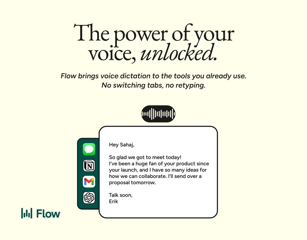 AI gets smarter when your input is complete. Wispr Flow helps you think out loud and capture full context by voice, then turns that speech into a clean, structured prompt you can paste into ChatGPT, Claude, or any assistant. No more chopping up thoughts into typed paragraphs. Preserve constraints, examples, edge cases, and tone by speaking them once. The result is faster iteration, more precise outputs, and less time re-prompting. Try Wispr Flow for AI or see a 30-second demo.